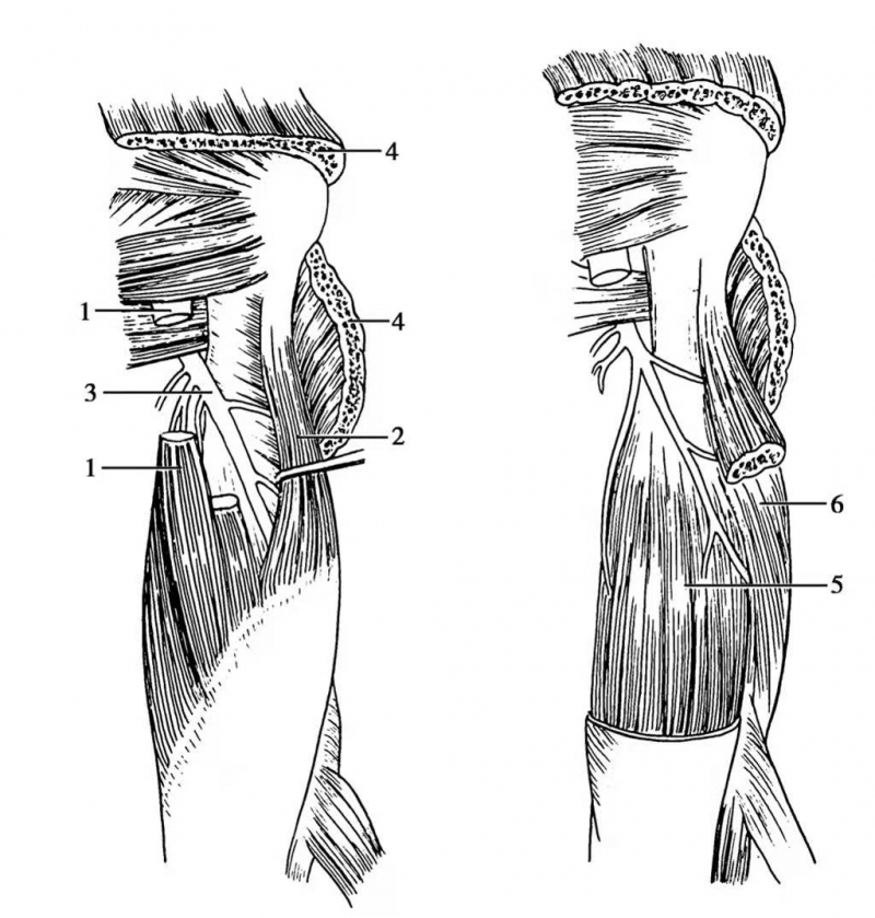 图1 上臂桡神经解剖 1.肱三头肌长头(已切断);2.肱三头肌外侧头(已拉开);3.桡神经;4.三角肌(已切断);5.切去长头后显示肱三头肌内侧头;6.切去部分外侧头显示肱肌