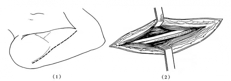 肘外侧切口可显露肘部桡神经段。切口沿肱桡肌内缘开始,直到肘关节前屈横纹,可绕过外侧作弧形切口。