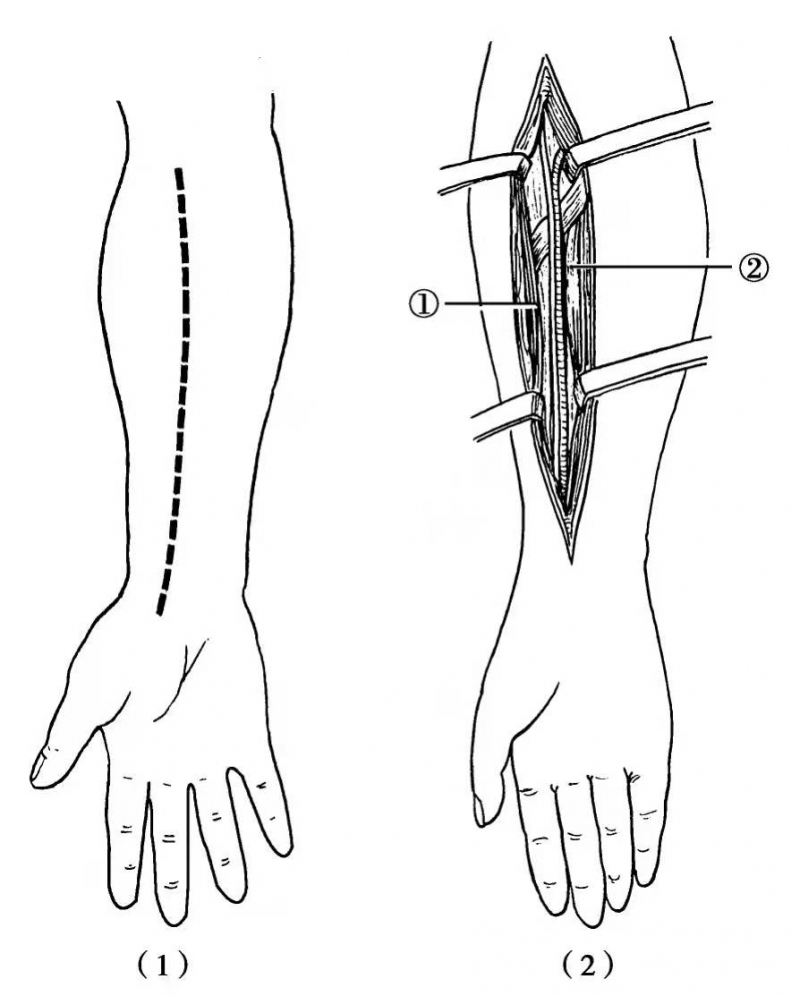 图8 桡神经浅支手术切口及显露(1)手术切口;(2)分开肱桡肌①及桡侧腕屈肌②之间可见桡神经及桡动脉
