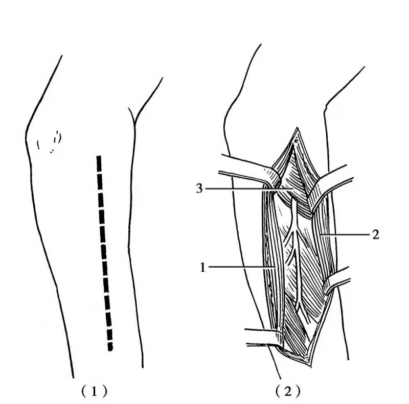 图6 显露桡神经肱骨段切口(1)切口;(2)在三角肌、肱三头肌外侧头与肱三头肌长头之间,可见桡神经与伴行的肱深动脉
