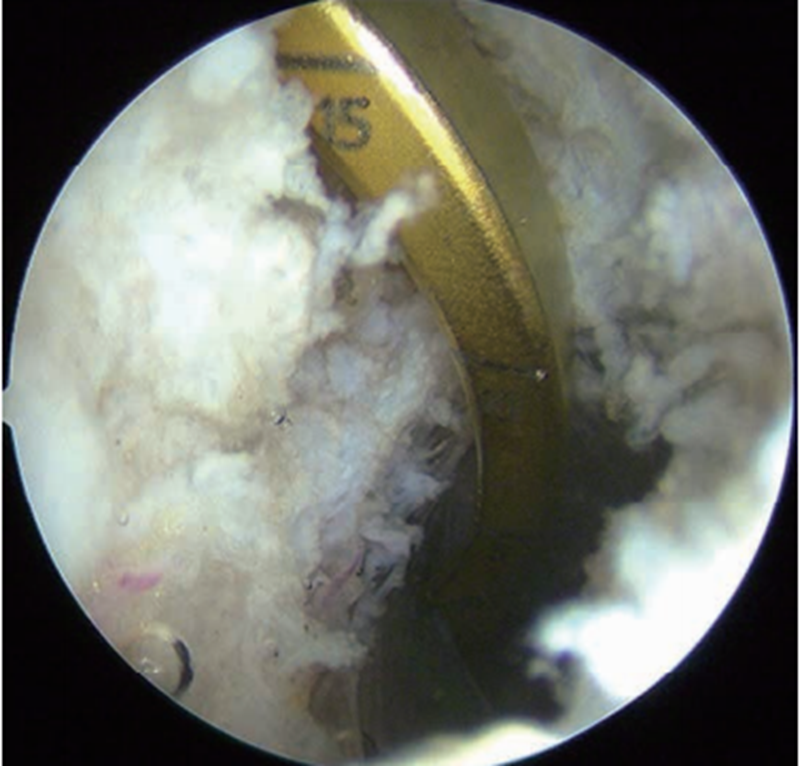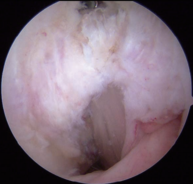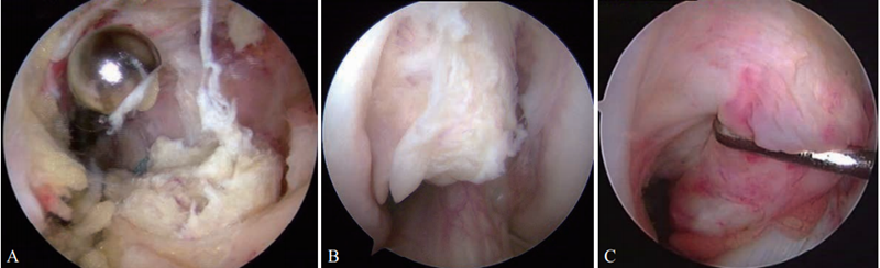 从膝关节后外侧入路经后外侧间室,穿过后纵隔到后内侧间室,光源照射直视下做后内侧入路