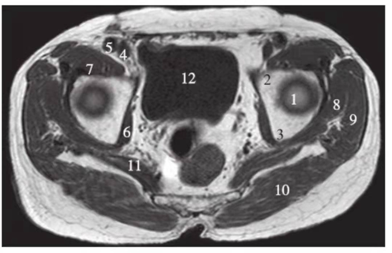 1.臀中肌;2.髂骨;3.臀大肌;4.髂腰肌;5.股骨头骺线;6.股骨头;7.髋臼后唇;8.梨状肌;9.关节囊及髂股韧带;10.闭孔内肌;11.股方肌;12.大收肌