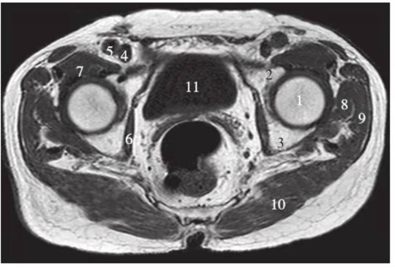 1.股骨头;2.耻骨;3.坐骨;4.股静脉;5.股动脉;6.闭孔内肌;7.髂腰肌;8.臀小肌;9.臀中肌;10.臀大肌;11.膀胱