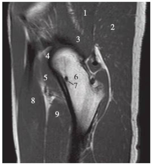 1.髂骨;2.臀大肌;3.圆韧带;4.股骨头;5.坐骨;6.闭孔外肌;7.耻骨肌;8.大收肌