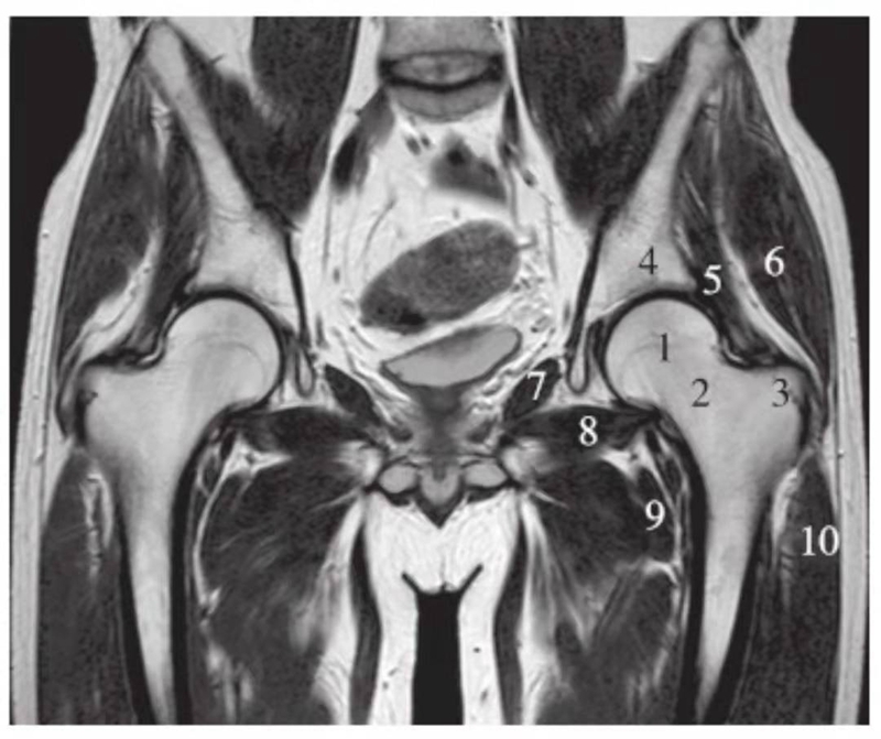 1.股骨头;2.股骨颈;3.髋臼窝内脂肪;4.髂骨;5.臀小肌;6.臀中肌;7.闭孔内肌;8.闭孔外肌;9.股外侧肌;10.股内侧肌