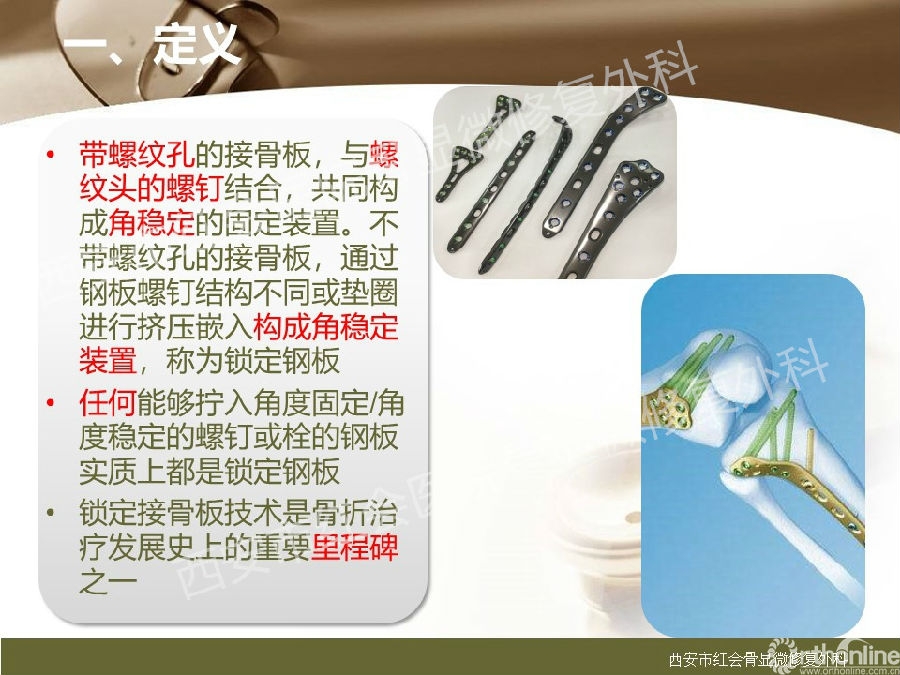 编者按:带螺纹孔的接骨板,与螺纹头的螺钉结合,共同构成角稳定的固定装置。不带螺纹孔的接骨板,通过钢板螺钉结构不同或垫圈进行挤压嵌入构成角稳定装置,称为锁定钢板。锁定接骨板技术是骨折治疗发展史上的重要里程碑之一。西安市红会医院骨显微修复外科张世辉医生从锁定钢板的作用、应用原则、适应证、禁忌证和优缺点等出发,分享了锁定钢板外置在下肢开放骨折中的应用,供广大同道参考学习。