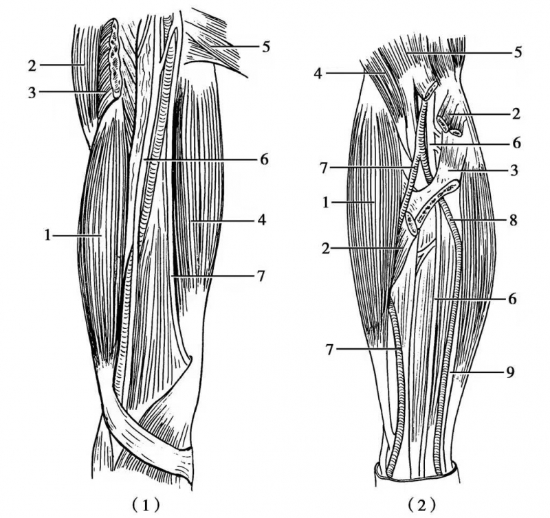 图1 正中神经解剖(1)正中神经上臂段:1.肱二头肌;2.三角肌;3.胸大肌(已切断);4.肱三头肌;5.背阔肌;6.正中神经与肱动脉;7.尺神经;(2)正中神经前臂段:1.肱桡肌;2.旋前圆肌(已切断);3.指浅屈肌(已切断);4.肱肌;5.肱二头肌(筋膜已切除);6.正中神经;7.桡动脉;8.尺动脉;9.尺神经