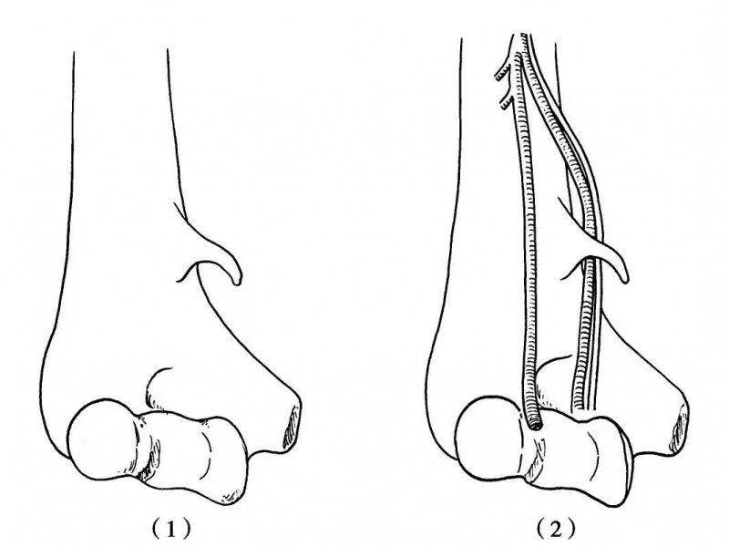 图2 肱骨的髁上骨刺及其韧带与正中神经和尺动脉的关系(1)肱骨的髁上骨刺;(2)肱骨的髁上骨刺及其韧带将正中神经及尺动脉推向其后方绕过