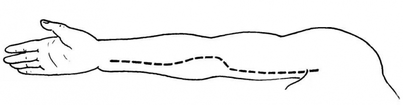 病者仰卧位,上臂外展伸直于手术台上,切口从胸大肌肌腱处开始,沿腋前臂和臂内侧肌间隔下延,紧贴肱二头肌的内侧缘,于上臂下段转到肘关节前方,顺着肘前横纹向外侧,于肘窝正中转向前臂中线。作弧形伸展至腕部(图3)。