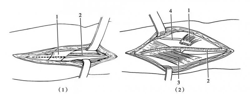 图5 肘部正中神经的显露(1)1.在虚线切开肱二头肌腱膜;2.可显露出其深面的正中神经及肱动脉;(2)3.正中神经从旋前圆肌两个头之间穿过进入前臂;4.为前臂外侧皮神经