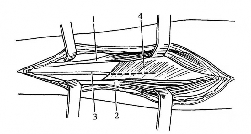 图6 前臂掌侧正中神经下段的显露在1.桡侧腕屈肌与2.掌长肌之间的虚线切开即可显露;3.正中神经及4.深筋膜