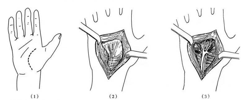 图7 腕管部正中神经探查手术(1)切口;(2)显露掌筋膜及腕横韧带;(3)切开腕横韧带即可露出正中神经