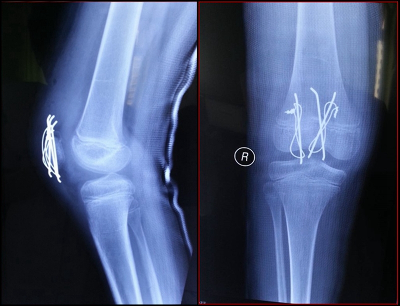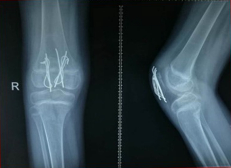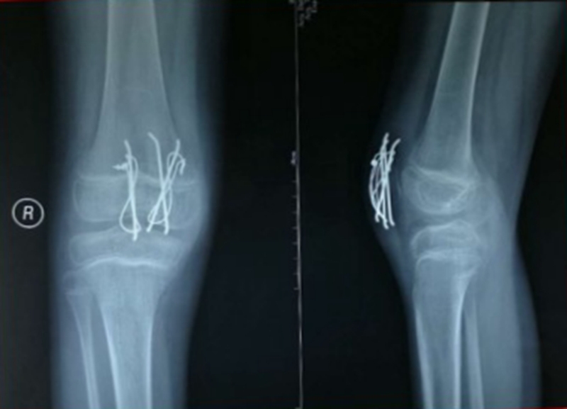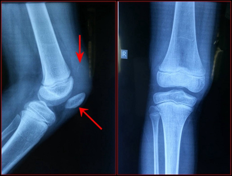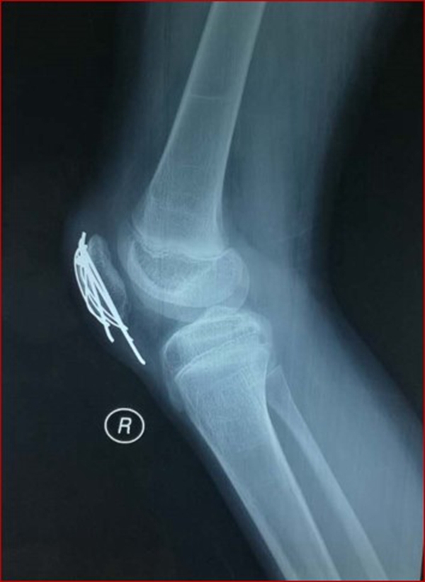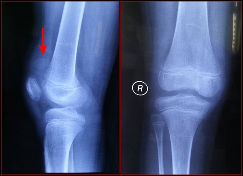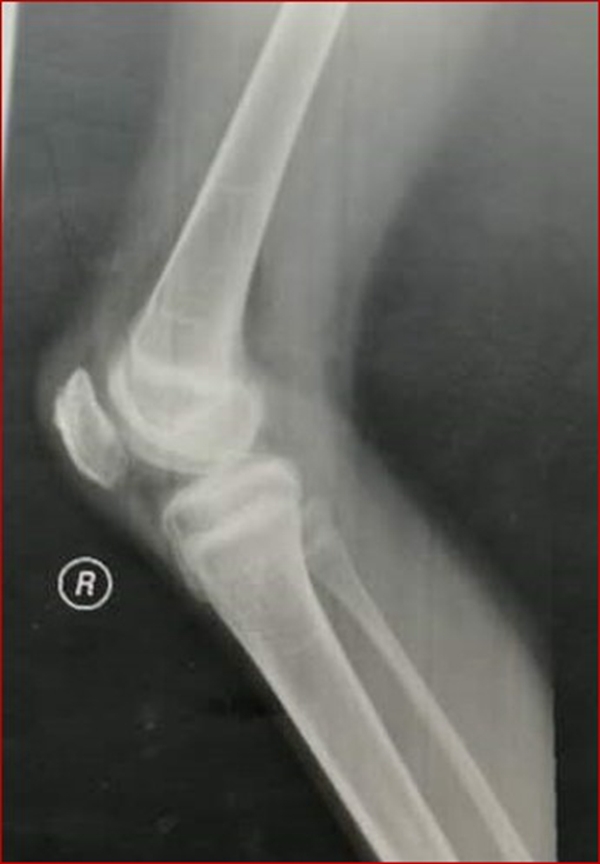 现病史:患儿于3周前下台阶时踩空而不慎摔伤右膝,当即感右膝肿胀、疼痛、不敢活动。于当地县医院就诊,行右膝拍片后诊为“右膝软组织损伤”,建议石膏固定3周。患儿于伤后3周门诊复查,再次拍片后诊为“右髌骨骨折”,建议手术治疗,家属为进一步诊治来我院门诊,门诊以“右髌骨套状撕脱骨折”收入院。