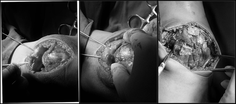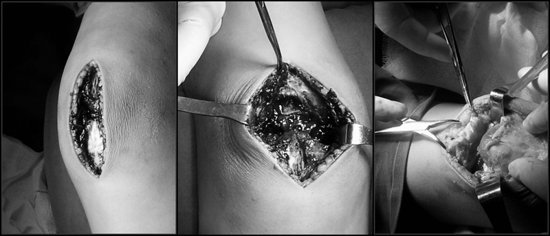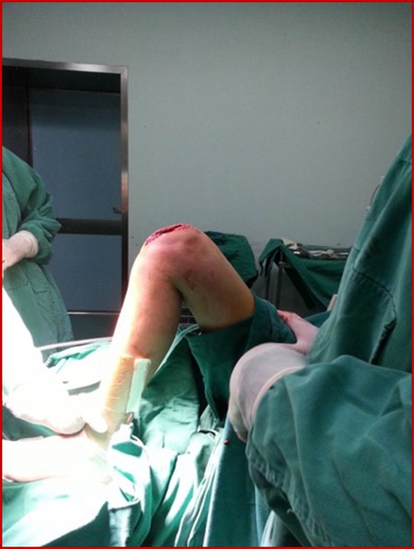 手术采取腰麻,在止血带下进行。行膝前正中切口,电刀止血。