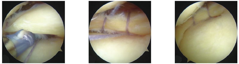 图3 关节镜下手术过程术中照 a 缝合器行垂直褥式缝合;b进行第二针缝合;c 缝合完毕后状态