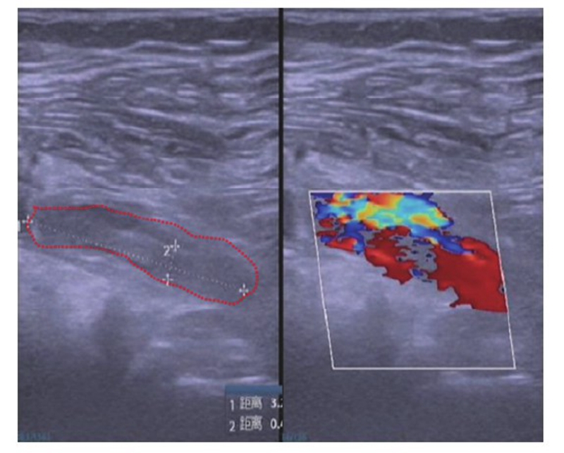 图7 右侧腘窝处皮下血管内低回声点提示浅表静脉早期血栓形成