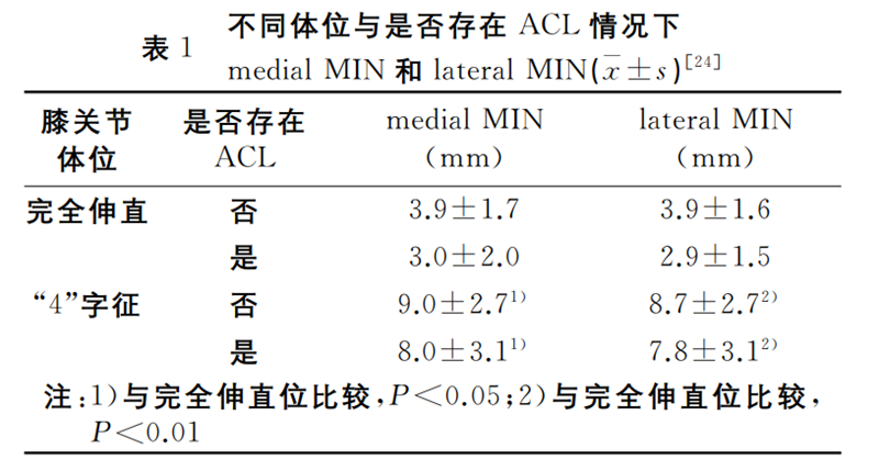 2013年,Nishimura等使用MRI对97例膝关节影像报告对对腘动脉与前外侧和前内侧关节镜入路之间的关系进行了测量及分析,在前交叉韧带缺如、完整及完全伸直、“4”字征体位条件下,分别测量内侧关节镜入路与腘动脉连线到胫骨平台后缘的最短距离(shortest distance from posterior tibial cortex to PA on the line from the medial border of the patellar tendon to popliteal artery,medialMIN)和外侧关节镜入路与腘动脉连线到胫骨平台后缘的最短距离 (shortest distance from posterior tibial cortex to lines that run to PA on the line from the lateral border of the patellar tendon to popliteal artery,lateralMIN),实验结果显示无论前交叉韧带存在与否,“4”字征体位时,lateralMIN 明显大于膝关节完全伸直时的距离(表1)。通过对数据进行统计学分析,无论前交叉韧带存在与否,使用“4”字 征体位时,腘动脉都距离胫骨平台更远。Nishimura认为运用All-inside技术修复外侧半月板后角 时使用“4”字征体位更安全。2015年,Cuéllar等在膝关节不同的屈曲角度情况下,通过前外侧入路对外侧半月板后角进行修复时,缝合器针尖与腘动脉的距离在膝关节屈曲90° 时为13.0mm,45°时为10.5mm,完全伸直时为5.5mm。实验结果证实在膝关节屈曲90°时能够使腘动脉远离外侧半月板后角,从而降低腘动脉损伤风险。