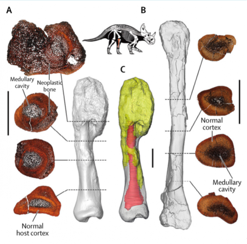 图1 在恐龙化石中发现的疑似患骨肉瘤的骨骼化石 The Lancet Oncology, Volume 21, Issue 8, 2020,