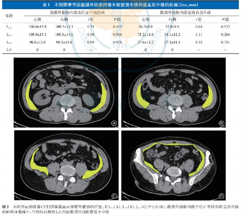 腹部CT观察提示L4-L5横断面位于耻骨联合与脐中上1/3水平处;L5-S1位于肚脐和耻骨联合中下1/3水平处;L3-L4大致位于脐平面,L2-L3位于脐头侧;在L2~L5节段腹部CT横截面上腹膜外脂肪内缘至腹壁前中线和腹直肌外缘的距离如所示。L5-S1水平处腹直肌深面存在腹膜外脂肪;自L2-3至L4-5,腹膜外脂肪内缘至腹壁前中线和腹直肌外缘的距离均逐渐变小,且左右两侧距离无明显差异(表1,图3)。