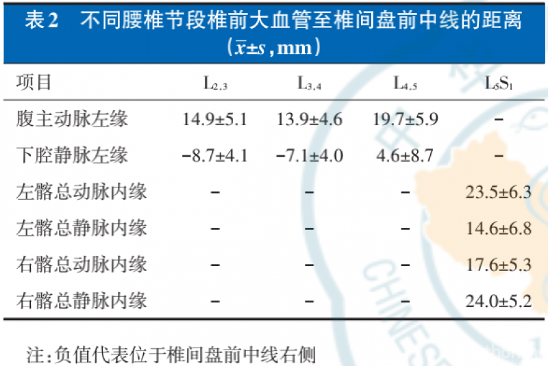 在L5-S1水平,椎间盘位于血管分叉之间,处于内侧的是左侧髂总静脉和右髂总动脉,其内缘分别距椎间盘前中线14.6±6.8mm、17.6±5.3mm(表2,图4)。