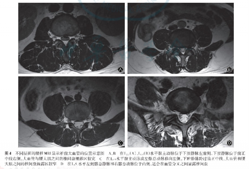 腰椎MRI T2加权横截面上观察提示腹主动脉位于下腔静脉左前侧,在L2-3、L3-4节段腹主动脉左缘分别距椎间盘前中线14.9±5.1mm、13.9±4.6mm,下腔静脉位于中线右侧,大血管和腰大肌之间的椎间盘裸露区距离较宽。