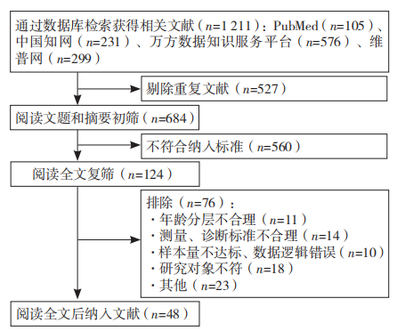 初检共获得相关文献1211篇,经逐层筛选后,最终纳入48篇横断面研究,共包含68932例研究对象。文献筛选流程及结果见图1。