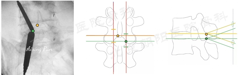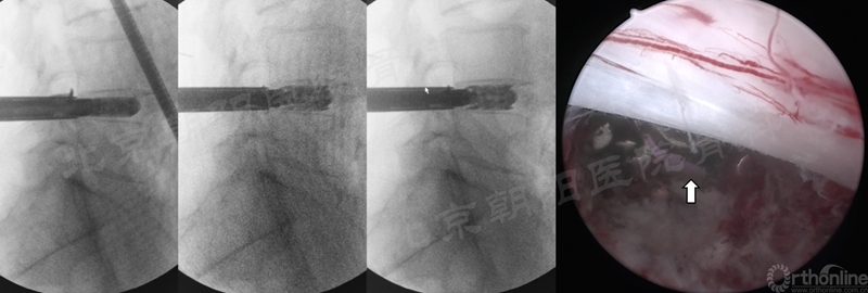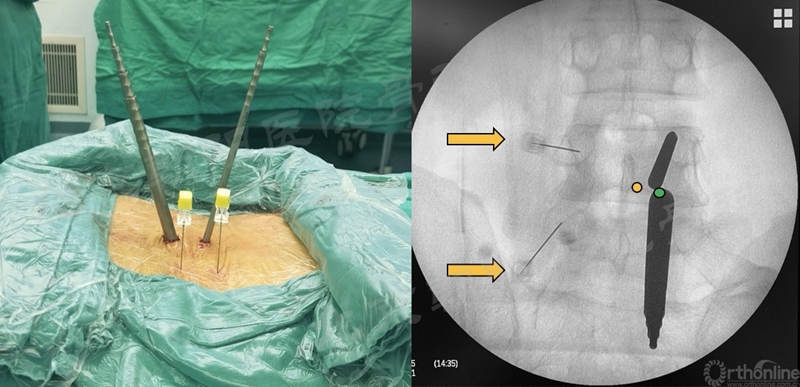 Tips-1:在对侧椎弓根投影位置临时放置2枚标记针,有助于术者空间定位,防止因长时间操作,或镜下结构辨认不清晰时失去方向,做到对侧,甚至做错节段。