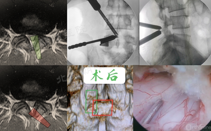 #1例UBE,术前计划减压范围如绿色部分,术中减压操作集中在了硬膜背侧,甚至多数时候在对侧操作,实际减压部位在红色部分,使椎管减压的效果不理想。