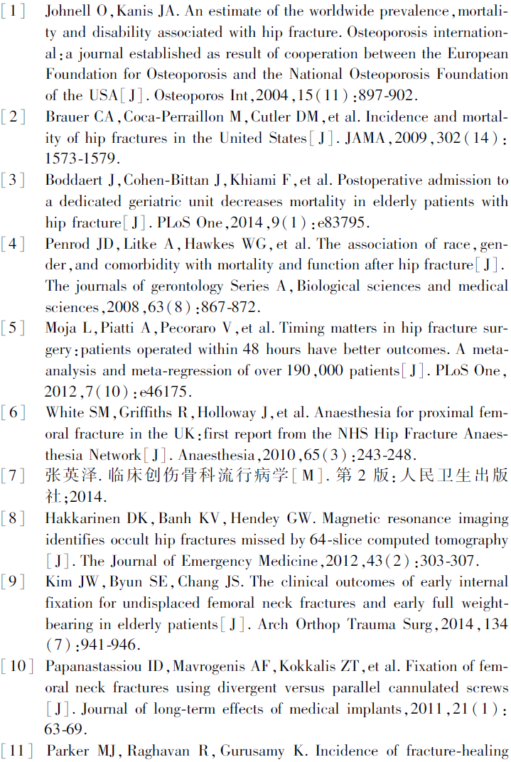 全球每年约有160万人出现髋部骨折,并且随着人口的持续增长,这一数字每10年增加25%[1]。髋部骨折会对老年病人造成严重后果,处理不当会导致严重预后不良,三分之一的老年髋部骨折病人在1年后死亡,而其余髋部骨折病人的日常活动和生活质量也受到了负面影响[2-3]。