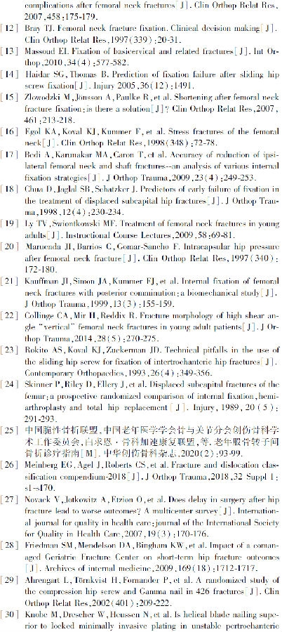 骨折复位不良是骨折愈合术后并发症、功能恢复较差和需要再次手术的重要指标。移位型股骨颈骨折可接受的复位标准是颈干角在130~150度之间,前倾角度在0~15度之间[17]。15度的外翻角是可以接受的,因为它可以增加稳定性,特别是在严重的后侧粉碎性骨折的情况下[18]。