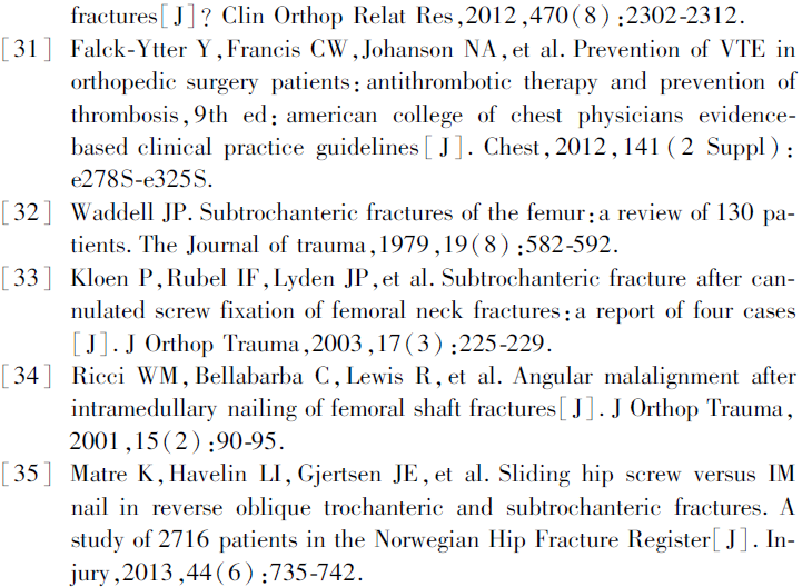 股骨转子间骨折分型方法众多,2018年OA/OTA分型将股骨转子间骨折分为:(1)简单的顺转子间骨折(31A1型):包括单纯大转子骨折或小转子骨折,两部分顺转子间骨折,外侧壁完整的粉碎顺转子间骨折;(2)外侧壁不完整的粉碎顺转子间骨折(31A2型);(3)反转子间骨折(31A3型)[26]。