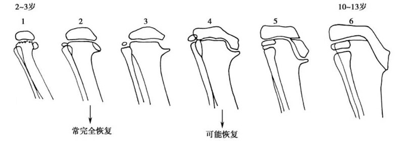 图1 婴儿型胫内翻(Blount病)随年龄增长的6个阶段