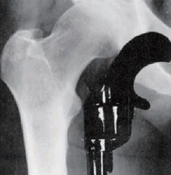 图4 “手枪柄”征 股骨近端在X线正位片上呈“手枪柄”样畸形,提示髋关节股骨颈前外侧明显骨性突起