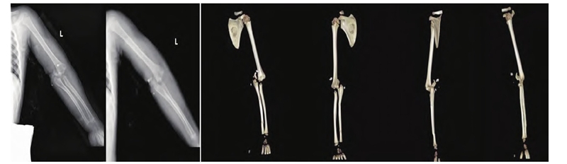 4岁女性患儿,因“外伤致左上肢肿痛、畸形伴活动受限5h余”入院。患儿行走时不慎从楼梯上摔倒,左手掌撑地后身体失去平衡,当即感左上肢肿痛畸形伴活动受限,左上肢多处挫伤且流血不止,急至外院就诊。予以伤口包扎,