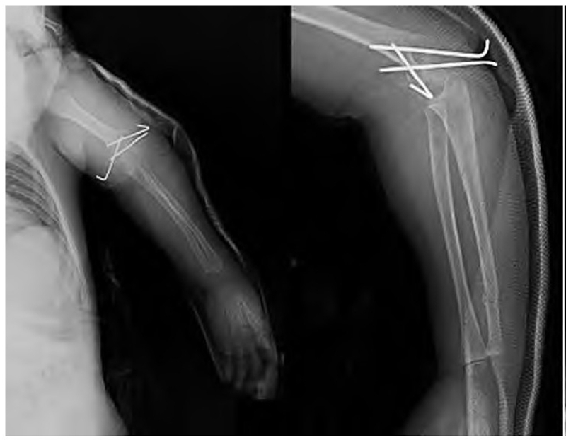 入院诊断:左侧开放性肱骨髁上骨折,左孟氏骨折,左尺桡骨远端骨折,左上臂桡神经损伤,左肘关节异物。