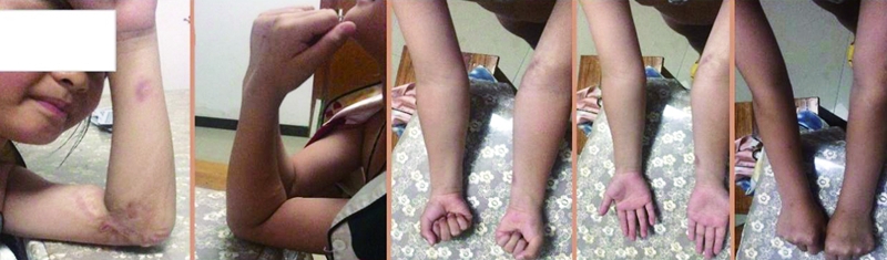 术后予止血、消肿、口服甲钴胺营养神经及抗感染对症治疗,定期创口换药。术后复查DR片提示骨折断端对位对线可,内固定位置良好,桡骨头复位良好,肘关节位置良好(图2)。术后7周拔除克氏针进行功能训练(图3)。术后3个月复查DR片提示骨折断端骨折线已消失,可见较多骨痂影(图4)。随访3年10个月,患儿无肘内、外翻畸形,无肘关节及腕关节活动受限(图5),肘关节 Mackay功能评分为优。