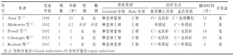 儿童肱骨髁上骨折合并同侧孟氏骨折的损伤报道极为罕见,查阅文献共计5例儿童肱骨髁上骨折合并同侧孟氏骨折的报道,均为个案报道,均为伸直型肱骨髁上骨折及 Bado Ⅰ型孟氏骨折 (见表1)。Minkowitz等报道了1例0.1岁患儿,为 GartlandⅠ型髁上骨折合并同侧孟氏骨折,予以手法复位孟氏骨折后石膏固定患肢。Powell等报道了1例2岁患儿,为 GartlandⅡ型髁上骨折合并同侧孟氏骨折,首先闭合复位经皮克氏针固定肱骨髁上骨折,接着闭合复位孟氏骨折并以克氏针髓内固定尺骨。Rouhani等报道了1例4岁患儿,为 GartlandⅡ型髁上骨折合并同侧孟氏骨折,按序闭合复位肱骨髁上骨折及孟氏骨折后予以石膏外固定。Cobanoglu等报道了1例5岁患儿,为 Gartland Ⅰ型髁上骨折合并同侧孟氏骨折,首先闭合复位经皮克氏针固定肱骨髁上骨折,接着闭合复位孟氏 骨折并以克氏针髓内固定尺骨。Arazi等报道了1例13岁的患儿,为 GartlandⅢ型髁上骨折合并同侧孟氏骨折及桡骨远端青枝骨折,首先切开复位经皮克氏针固定髁上骨折,接着手法复位孟氏骨折后皮质螺钉固定肱桡关节。本例患儿属于 Gartland Ⅲ型肱骨髁上骨折,合并同侧 BadoⅠ型孟氏骨折及尺桡骨远端骨折,骨折之外存在开放性外伤及异物,予以肘部清创后取出异物,再闭合复位肱骨髁上骨折后克氏针内固定,最后手法复位孟氏骨折。