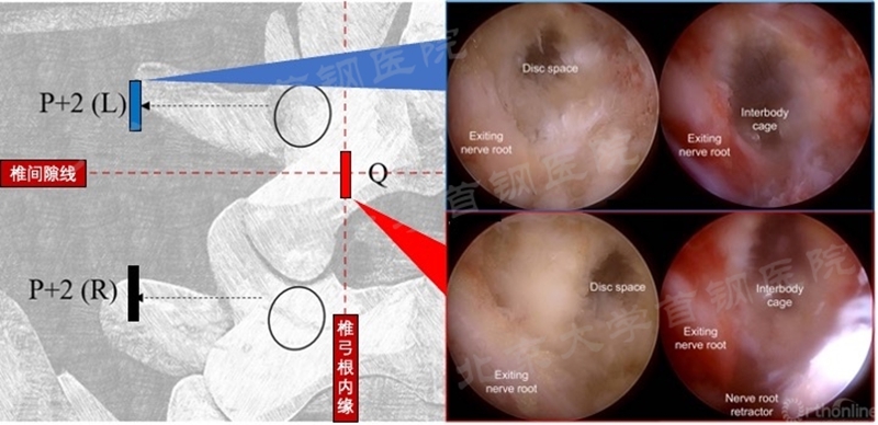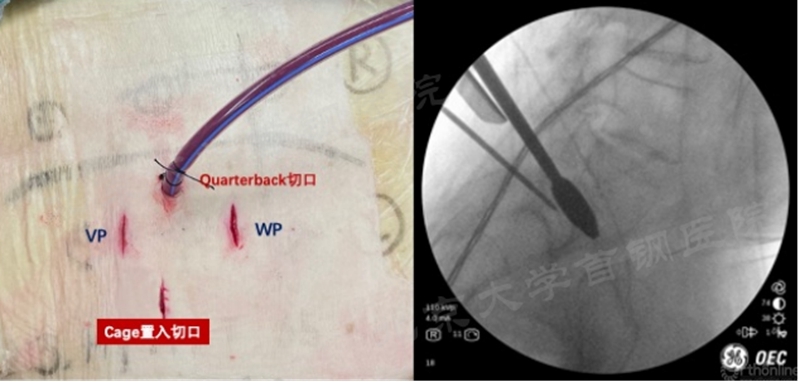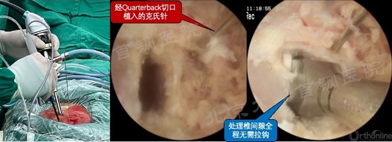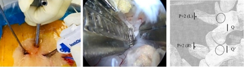 4. 在常规UBE-LIF中作为放置硬膜牵开装置的通道,有时将其称为Quarterback-K切口。我中心现常规通过此切口放置克氏针进行硬膜牵拉,显著提高处理椎间隙、纤维环缝合过程中的安全性和效率(图4);