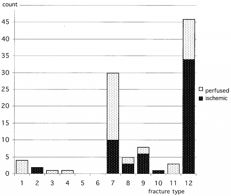 图5 12种基本骨折类型在100例肩关节中的分布,以及各种类型所对应的肱骨头缺血的比例。需要注意的是本研究中的病例具有一定程度选择偏倚(均需要做手术),因此包含了较高比例的复杂类型肱骨近端骨折。