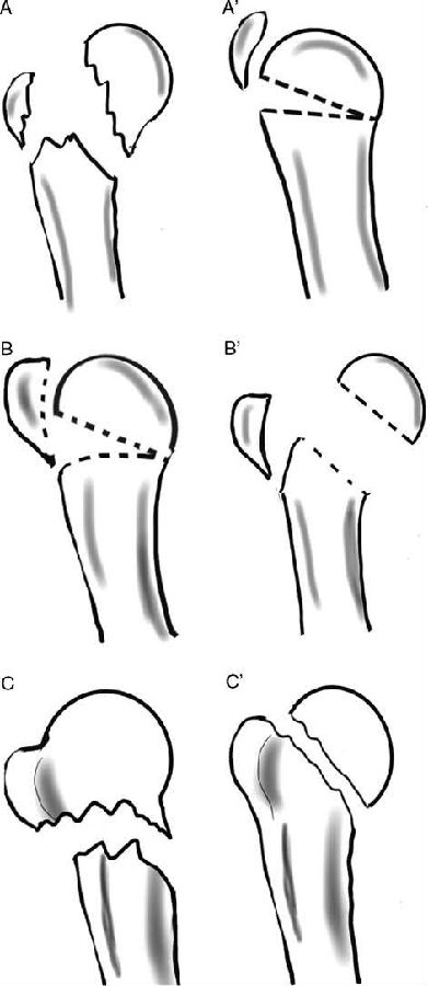 图4 第三条额外标准:头劈裂。左侧为典型头劈裂骨折的形态。右侧为特殊类型头劈裂骨折,该类型中两个骨折块的血运都得以保留。