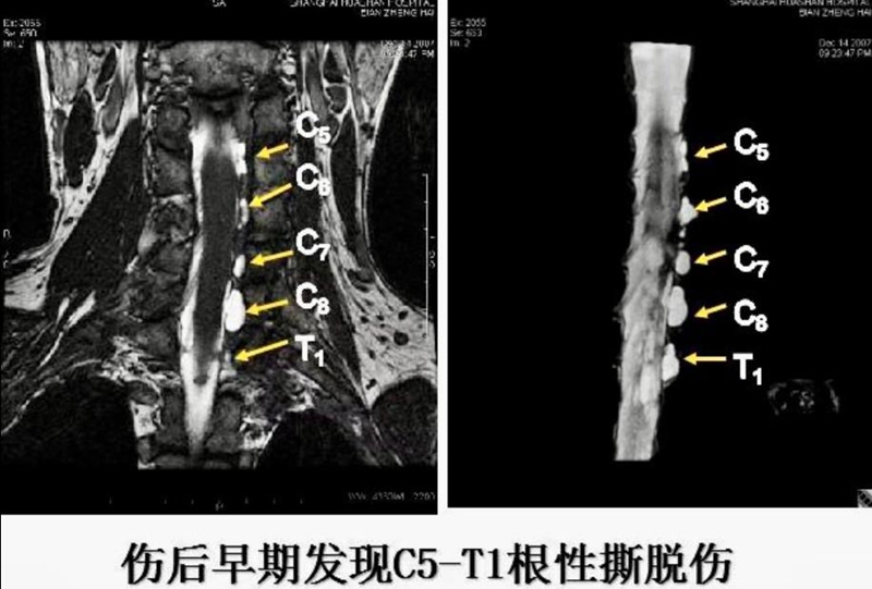 颈神经根在脊髓部位的丝状结构断裂,术中在椎孔附近可见撕脱的脊神经节,有时各神经根外观正常,在椎孔内断裂。
