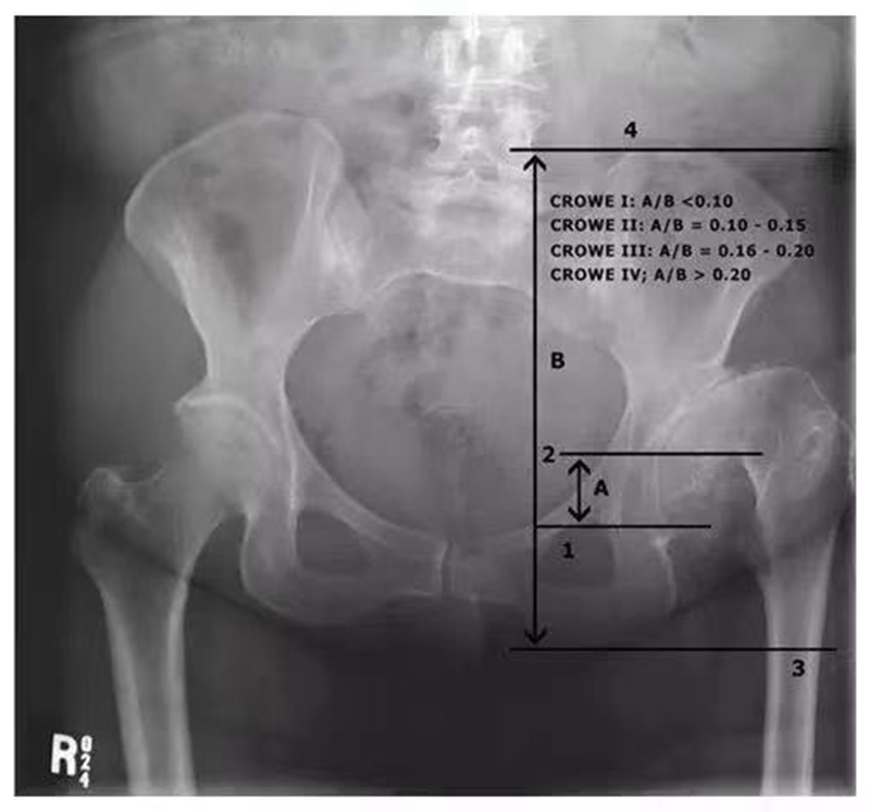 Crowe于1979年提出的分型,能够较好地量化髋关节的半脱位程度,对临床手术决策具有重要的指导意义。其主要依据股骨头移位距离占股骨头高度百分比或者占骨盆高度的百分比进行划分。