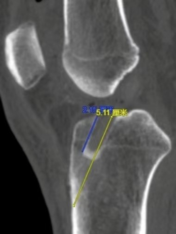 传统重建方法胫骨端的骨道为全骨道,长度约5cm左右(黄色线条),而全内重建胫骨端仅需要关节腔侧长约2.5cm左右的骨道(蓝色线条),保留了更多的骨质(图4/图5)。