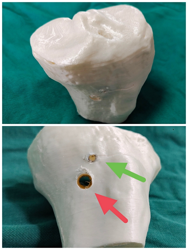 图4 同为8mm直径骨道,绿色为全内重建骨道外口,红色箭头为传统重建骨道外口