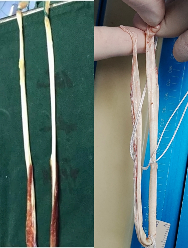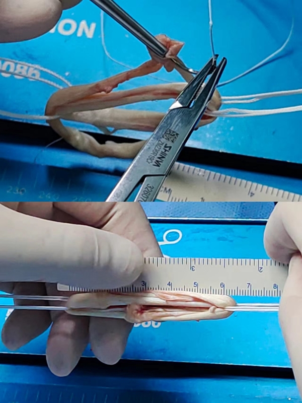 传统方法每根腘绳肌移植物只能折叠一次,常见为2根肌腱折叠为4股,所以通常需要取同侧半腱肌腱及股薄肌腱两根肌腱甚至更多(见图2),重建完成后肌腱将有一部分残余在关节外,需切割后丢弃。