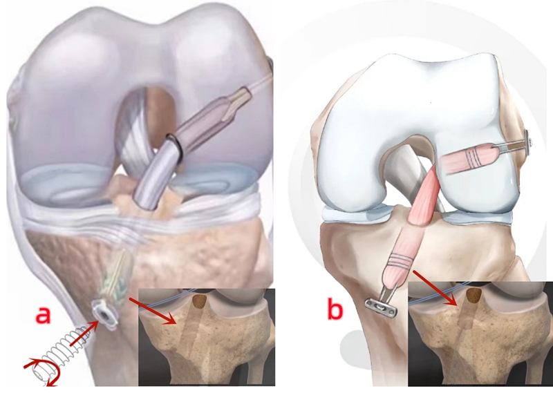 本文将以应用最为广泛的取自体腘绳肌腱重建前交叉韧带为例,来阐述全内重建的优点。与传统关节镜下重建方式相比,全内重建手术设计的核心区别在于移植物胫骨端的固定方式不同(见图1),并因此独特设计而具有以下优点: