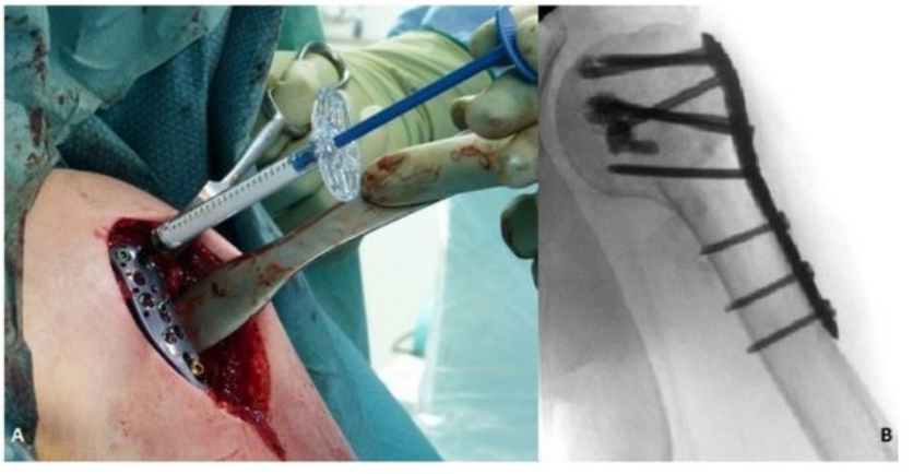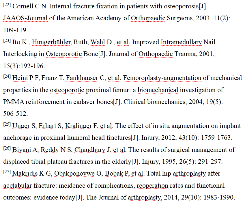 丙烯酸骨水泥在骨科手术中发挥着重要作用,其中聚甲基丙烯酸甲酯(PMMA)已从最初的眼科和牙科领域,扩展至骨科领域,并广泛地应用于假体内植物的固定、肿瘤和椎体骨折的治疗。骨质疏松性股骨近端骨折使用骨水泥强化的内固定系统可以减少约50%的失败率,主要适应症是不稳定型脆性骨折[24]。对骨科医生来说,骨量减少的肱骨近端骨折患者的治疗充满挑战。尽管内植物的设计不断改良,但螺钉或螺旋刀片在肱骨近端松质骨内的把持力仍然不足,而这也是内固定失败最主要的原因之一。骨水泥强化技术即将骨水泥注入肱骨头内,填补了内植物与肱骨头之间的空隙,从而增强内植物的把持力[25]。近年来,采用中空的螺钉结合角度稳定钢板系统,骨水泥可以通过中空的螺钉注入,达到骨水泥强化的效果[25]。骨质疏松性胫骨平台骨折与髋部骨折、肱骨近端骨折都不同,它是由于垂直应力直接作用于骨量减少的软骨下骨组织,造成关节面的凹陷和/或劈裂;其经典手术方式是通过植入自体或异体松质骨,支撑重建关节面[26]。但是,自体或异体松质骨在骨折愈合阶段,无法提供足够的力学支撑,造成关节面塌陷,利用骨水泥强化技术可能改善上述情况。