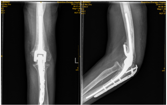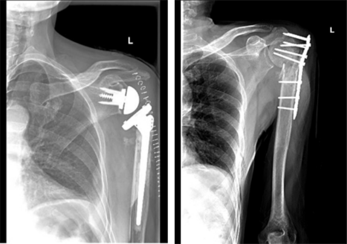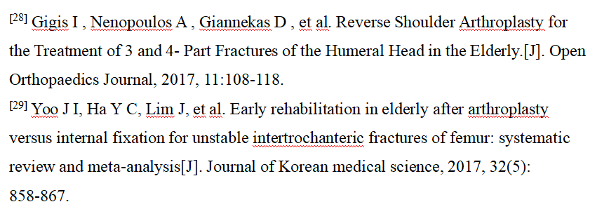 老年人关节内骨折合并骨质疏松症时,软骨下骨质量差,骨折块易嵌入关节面,解剖复位困难,骨折复位在下地负重或关节活动时难以维持,因此内固定治疗效果不佳。此时可酌情选择关节置换治疗,能够获得更好的预后。当骨折未累及关节面,但存在股骨头缺血性坏死风险时,例如股骨头下骨折或肱骨近端骨折,关节置换术的疗效优于内固定[27][28][29]。随着反肩关节置换术的出现,越来越多的骨科医生选择关节置换术治疗复杂的肱骨近端骨折,获得了良好的治疗效果;而肘关节置换术已经成为复杂骨质疏松性肱骨远端骨折的常规治疗手段,临床研究也验证了其优良且可靠的治疗效果[28]。因此,当骨质疏松性骨折骨质量差,骨折碎片较小时,人工关节置换术应首先考虑。