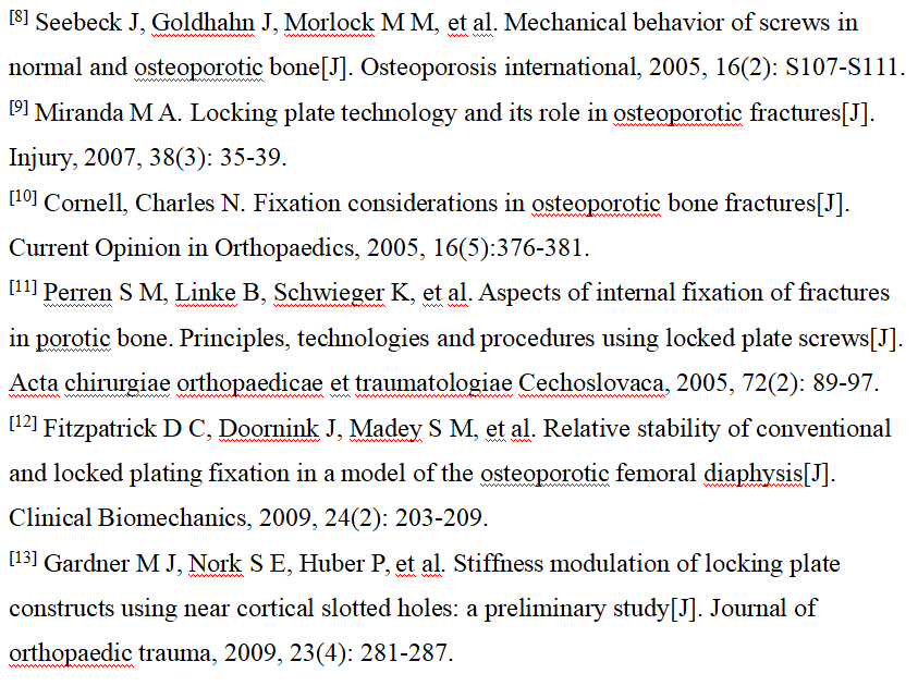 锁定钢板在承受轴向载荷时会发生微小弯曲,由此产生的骨折块间微动是不对称的,越靠近钢板侧的皮质,骨折块间微动越小,越不利于骨痂生成,最终导致骨痂形成的不对称。为了克服锁定钢板的这些缺陷,近年来也出现许多新的技术,例如“对侧皮质锁定技术”和“近侧皮质开槽技术”,其目的均是为了降低锁定钢板的刚度,减少因刚度过高导致的不愈合[13] [14] [15]。“对侧皮质锁定技术”为了增加弹性和防止对侧皮质承受的应力过大,其使用的锁定螺钉直径较传统螺钉小,因而可能会过早的发生疲劳断裂[16]。而“近侧皮质开槽技术”不需要使用特制的锁定螺钉,但是近侧皮质需提前开槽。尽管这些新技术的效果已经得到了生物力学研究的证实,但是由于缺乏高级别的临床研究证据,目前其临床应用仍受到许多限制。