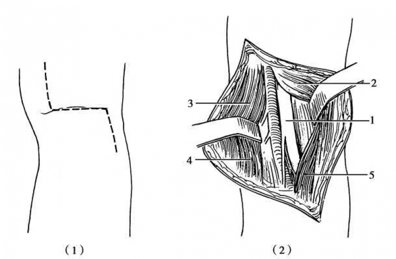 图2 在腘窝部探查胫神经(1)切口;(2)1.胫神经探查可从2.股二头肌与3.半腱肌之间进入,再下行时胫神经在4、5.腓肠肌两侧头之间